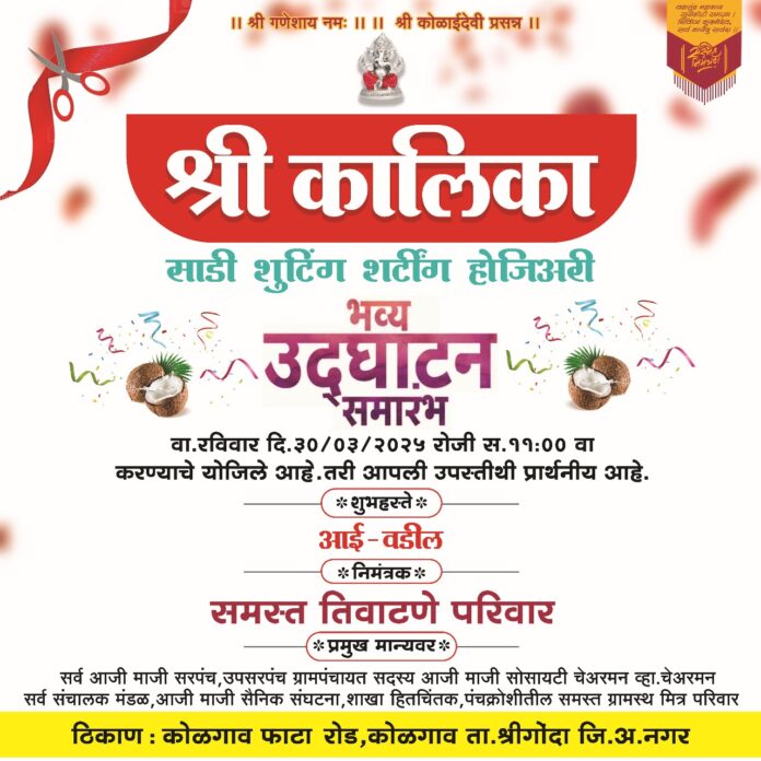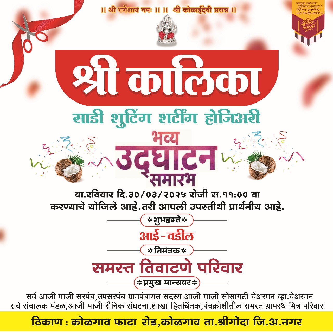 अभिजीत व अनिकेत तिवाटणे या दोन्ही बंधूंनी श्री कालिका कापड दालनाची मुहूर्तमेढ गुढीपाडव्याच्या शुभ मुहूर्तावर कोळगाव मध्ये रोवली. या कापड दुकानाच्या माध्यमातून साडी, शूटिंग, शर्टिंग, होजीअरी अशा भव्य दालनाचे कापड दुकान रविवार दिनांक 30 मार्च 2025 रोजी गुढीपाडव्याच्या मुहूर्तावर आपल्या आई-वडिलांच्या हस्ते उद्घाटन करून सुरू होत आहे. या व्यवसायातून ग्राहकांना उत्कृष्ट सेवा आणि योग्य दर देऊन तिवाटणे परिवाराच्या वतीने ग्राहकांशी असलेला ऋणानुबंध पुढच्या पिढीकडे असाच चालू ठेवण्यात अभिजीत व अनिकेत तिवाटणे यांनी निर्धार केला आहे.